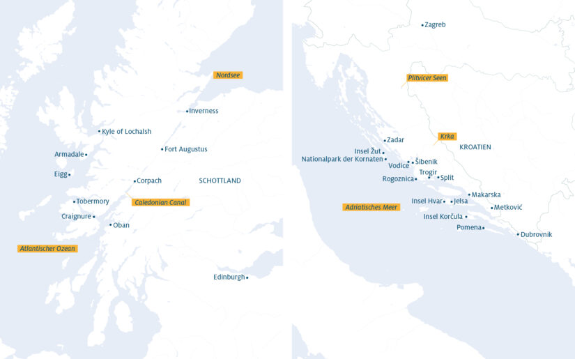 Entdecken Sie Rijeka, die Kulturhauptstadt Europas 2020/21 – und weitere reizvolle, pulsierende Städte in Kroatien. Erleben Sie die wundervolle Natur der unzähligen Inseln vor der kroatischen Küste und in den Naturparks im Hinterland wie etwa die berühmten Krka-Wasserfälle. Bei unseren Yachtkreuzfahrten Kroatien entlang der Küste von Kroatien nach Montenegro reihen sich Höhepunkt an Höhepunkt, unter anderem die an einen norwegischen Fjord erinnernde, atemberaubende Bucht von Kotor in Montenegro, gefolgt von Dubrovnik, der «Perle der Adria», beides UNESCO-Welterbe-Städte. Die Inseln Rab, Korčula und Mljet, die geschichtsträchtigen Städte Split und Šibenik, der Zrmanja-Canyon – Sie werden überrascht sein von der natürlichen Schönheit dieses Teils der Adria.