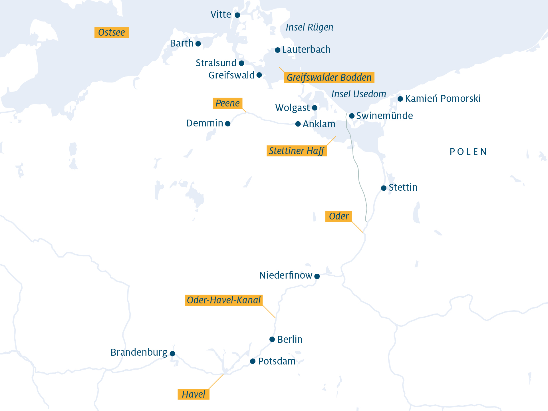 Diese exklusive Flusskreuzfahrt Oder, Ostsee & Peene, die Sie auf einer malerischen Route von der pulsierenden Hauptstadt Berlin bis zur historischen Hafenstadt Stralsund führt – ist etwas ganz Besonderes. Eine einzigartige Reise entlang idyllischer Flusslandschaften und durch atemberaubende Naturschutzgebiete die Ihnen die Gelegenheit bietet, traumhafte Orte Norddeutschlands aus einer ganz neuen Perspektive zu entdecken.