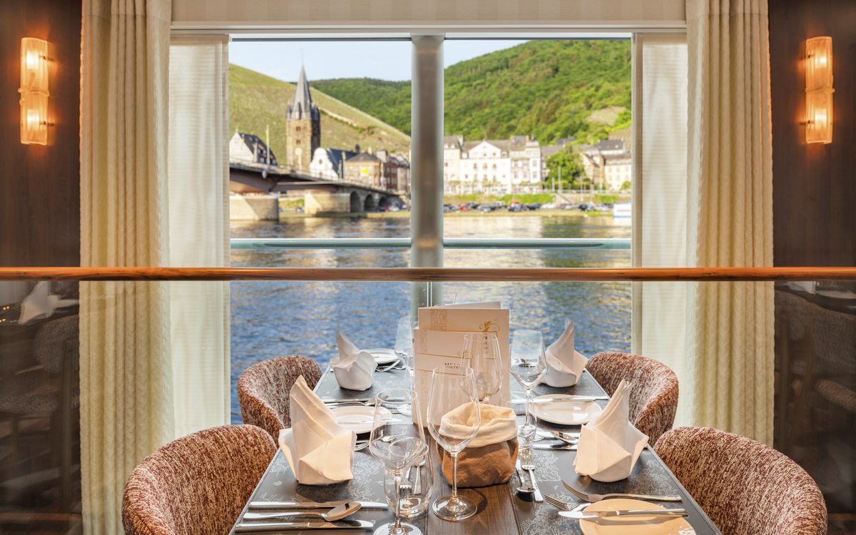 Am Vormittag nehmen Sie an einer Führung(1) durch das historische Cusanusstift in Bernkastel teil, bei der Sie Interessantes über die Geschichte und Architektur dieses bedeutenden Bauwerks erfahren. Gäste, die die Stadt lieber individuell erkunden möchten, können durch die malerischen Gassen der Altstadt schlendern, die Fachwerkhäuser bewundern, in kleinen Boutiquen stöbern oder in einem der gemütlichen Cafés die lokale Atmosphäre geniessen. Am Nachmittag können Sie die vorbeiziehende Mosellandschaft bewundern und lassen die ruhige Stimmung an Deck auf sich wirken.