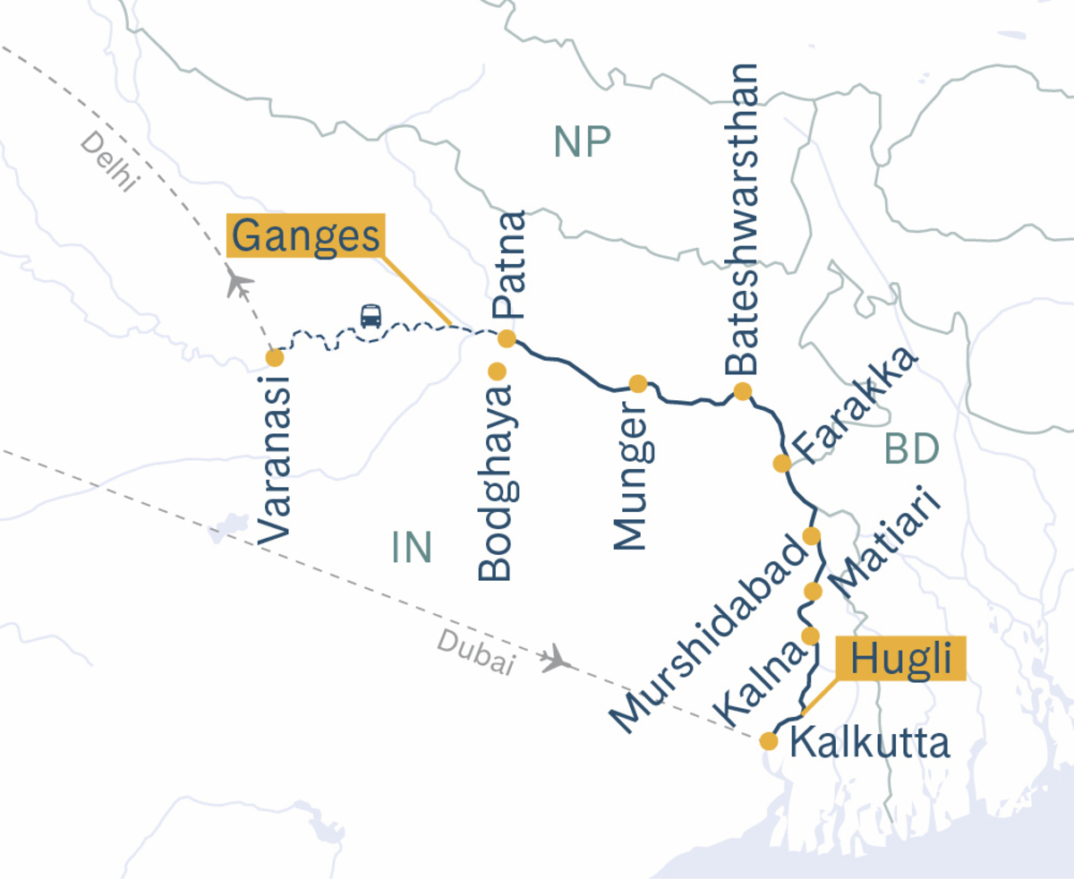 Diese Flusskreuzfahrt auf der RV Ganga Vilas führt Sie auf dem heiligen Ganges von Kalkutta bis Patna durch das kulturelle Herz Indiens. Sie erleben eindrucksvolle Tempel- und Palastanlagen, jahrhundertealte Handwerkskunst sowie das lebendige Alltagsleben entlang des Flusses. Highlights sind u. a. der Besuch des Rajbari-Tempelkomplexes in Kalna, die Palaststadt Murshidabad und die Ausgrabungen der antiken Vikramshila-Universität. Während der gesamten Reise geniessen Sie komfortable Unterbringung, regionale Küche und faszinierende Ausblicke auf die vorbeiziehende Flusslandschaft. Ein intensives Erlebnis für Kulturinteressierte, Entdecker und Geniesser.