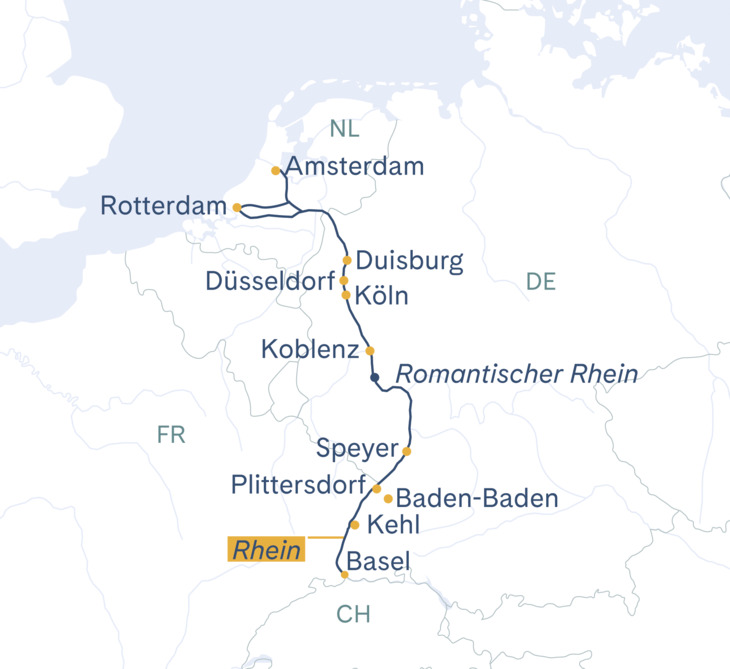 Individuelle Anreise nach Basel und ab 15:00 Uhr Einschiffung. Um 16:00 Uhr heißt es «Leinen los!». Genießen Sie den ersten Abend an Bord.