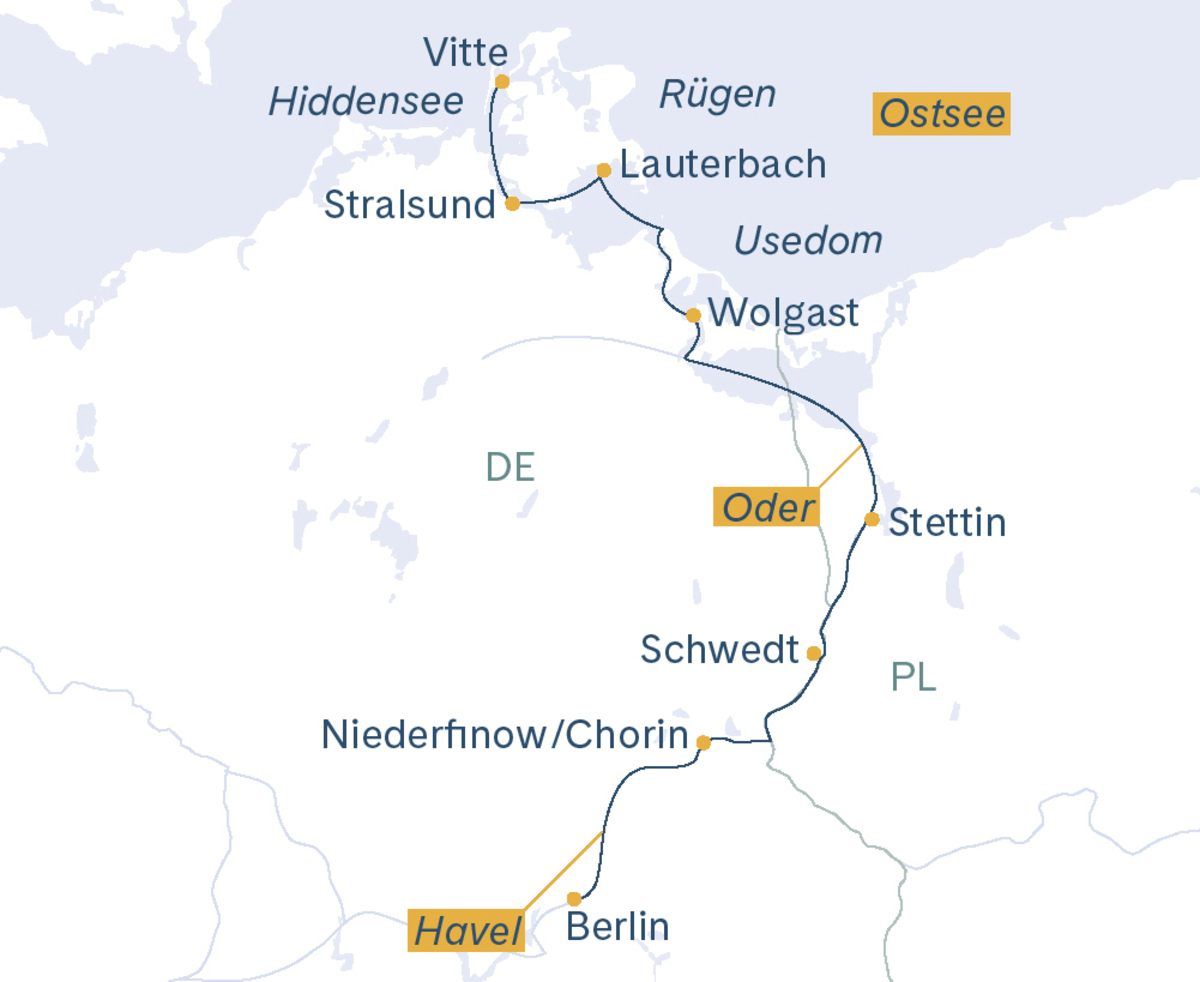 Die Reise führt weiter über Oder, Oderhaff und Peenestrom nach Wolgast. Flussabschnitte wechseln dabei zwischen den weiten Wasserflächen der Lagune ab. Wolgast gilt als «Tor zur Insel Usedom». Bei einem Busausflug(1) werden Ihnen die Ostseebäder Koserow und Zinnowitz nähergebracht. Sie können die typische Bäderarchitektur bewundern und von der Strandpromenade aus den Blick über die Ostsee schweifen lassen.
