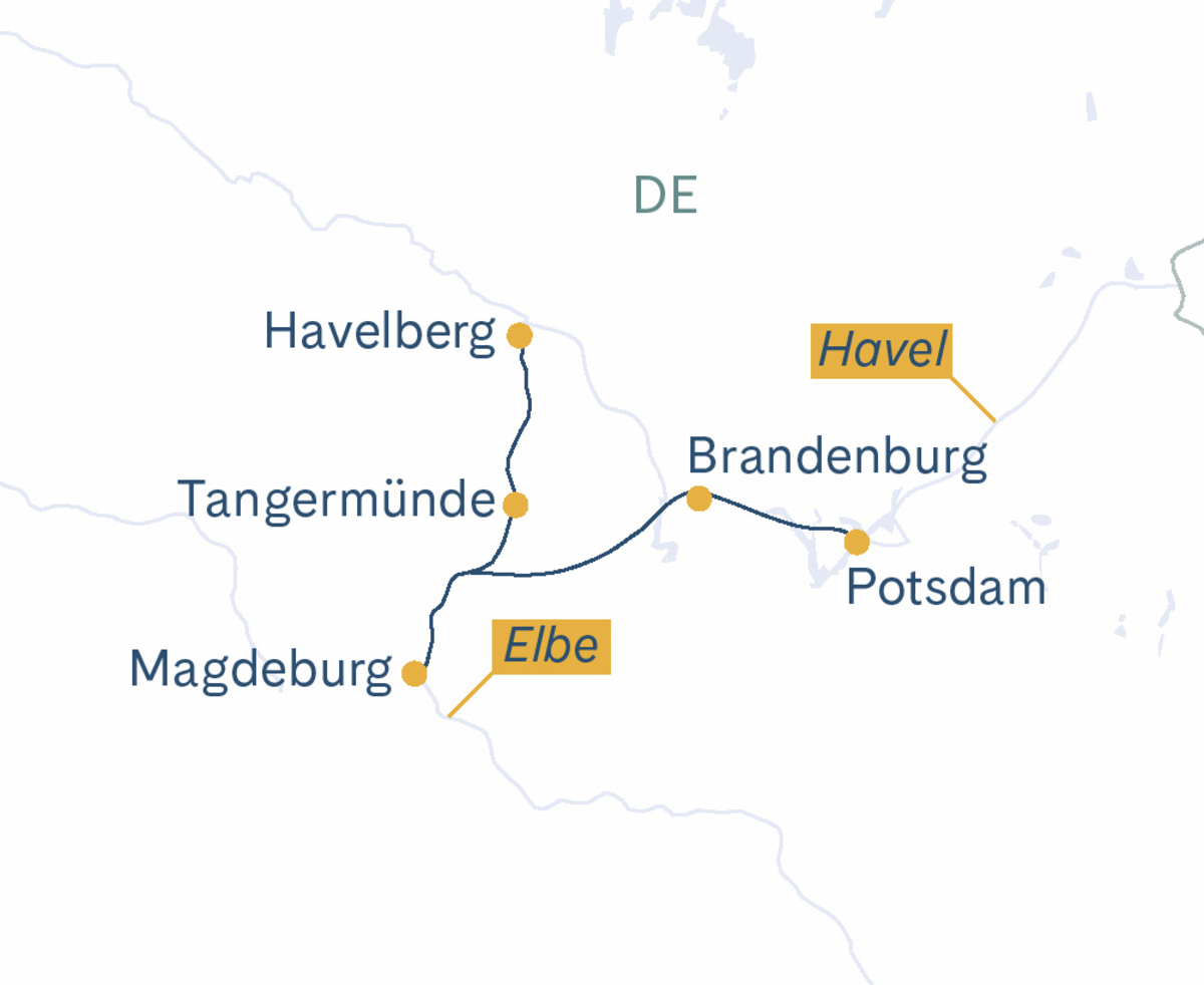 Der letzte Tag auf der Elbe und Havel steht an. Dieser ist ganz der Entspannung gewidmet. Die Elbe führt Sie durch die weiten flachen Ebenen der Altmark und durch den Plauer See. Die Havel bietet eine andere Szenerie; sie ist schmaler und gewundener, mit vielen kleinen Buchten und Uferbereichen sowie dem Beetzsee. Kurz vor Potsdam öffnet sich die Landschaft, und der Fluss führt Sie durch das malerische Umland der Stadt.