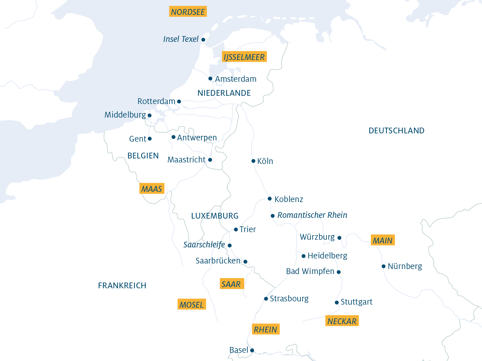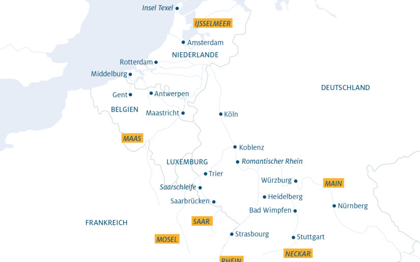 Unsere Flusskreuzfahrt Rhein führt Sie vorbei an steilen Weinbergen, mittelalterlichen Burgen und lebendigen Städten, die jeweils ihre eigene Geschichte und Charme haben. Die Flussreisen sind geprägt von der Vielfalt der Landschaften und der Kulturen entlang seiner Ufer. Von den Schweizer Alpen, wo der Rhein entspringt, bis zu den weitläufigen Niederungen der Niederlande, wo er in die Nordsee mündet, bietet jede Etappe der Rhein Flussfahrt ihre eigenen Höhepunkte.