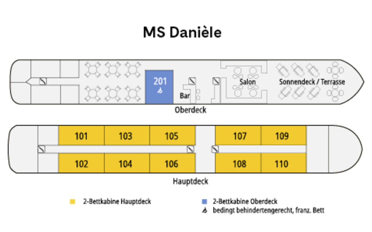 Die MS Danièle ist ein gemütliches Fluss-/Kanalschiff. Die geringe Grösse des Schiffs erlaubt Fahrten auf kleineren Flüssen und Kanälen in weniger bekannten Gebieten. Mit maximal 22 Gästen erleben Sie Reisen im familiären Rahmen.