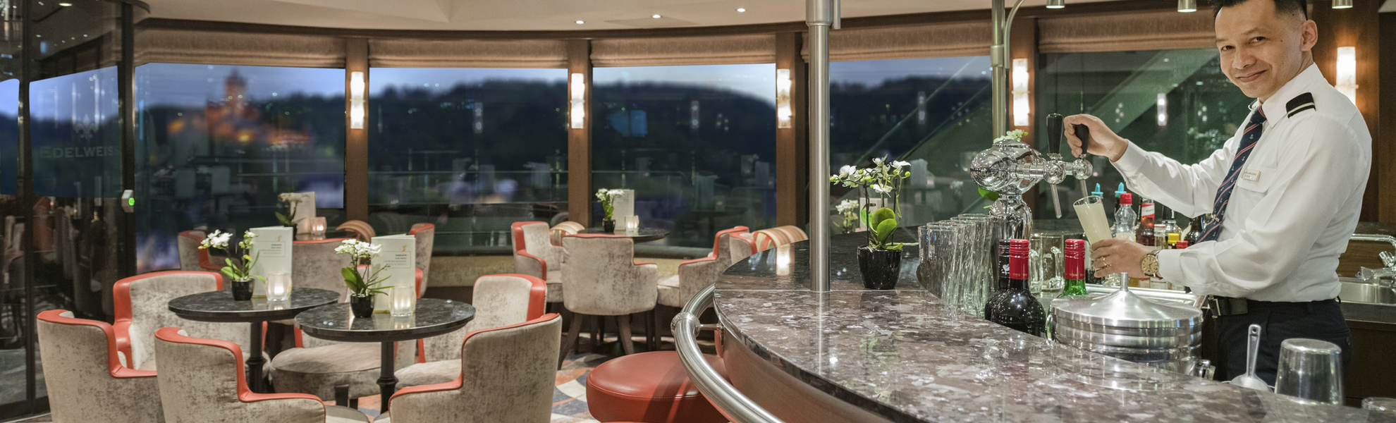 Stilvoll eingerichteter Panorama-Salon und Bar (die Bar befindet sich auf einem Zwischendeck zwischen Ober- und Mitteldeck) und Lido-Bar mit Aussenterrasse auf dem Oberdeck hinten. Gratis WLAN nach Verfügbarkeit. Grossflächiges, teilweise überdachtes Sonnendeck mit kleinem Pool, Liegestühlen und Sitzgruppen und Putting Green. Das Haupt-, Mittel- und Oberdeck sind mittels Lift verbunden