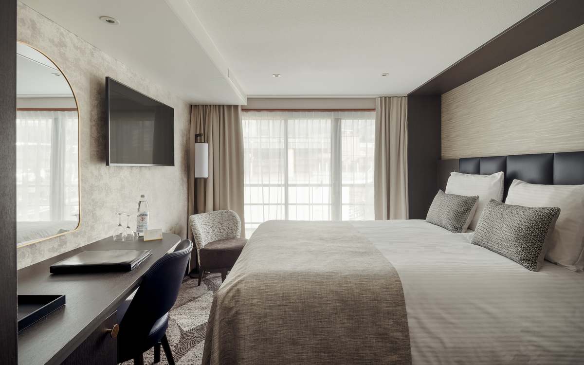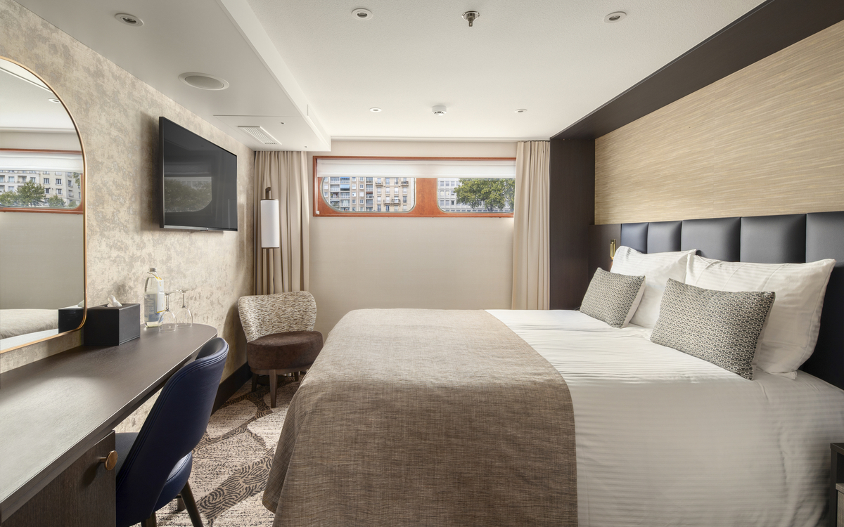 Alle Kabinen (ca. 14 m²) und Juniorsuiten (ca. 17 m²) liegen aussen, sind komfortabel und stilvoll eingerichtet. Auf dem Mittel- und Oberdeck mit französischem Balkon, auf dem Hauptdeck sind die kleineren Fenster aus Sicherheitsgründen nicht zu öffnen. Alle Kabinen sind mit Dusche/WC, Föhn, Kühlschrank, Nespressomaschine, Safe, TV/Radio und individuell regulierbarer Klimaanlage ausgestattet.