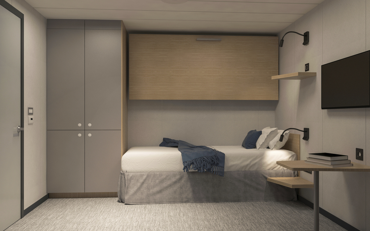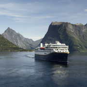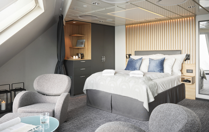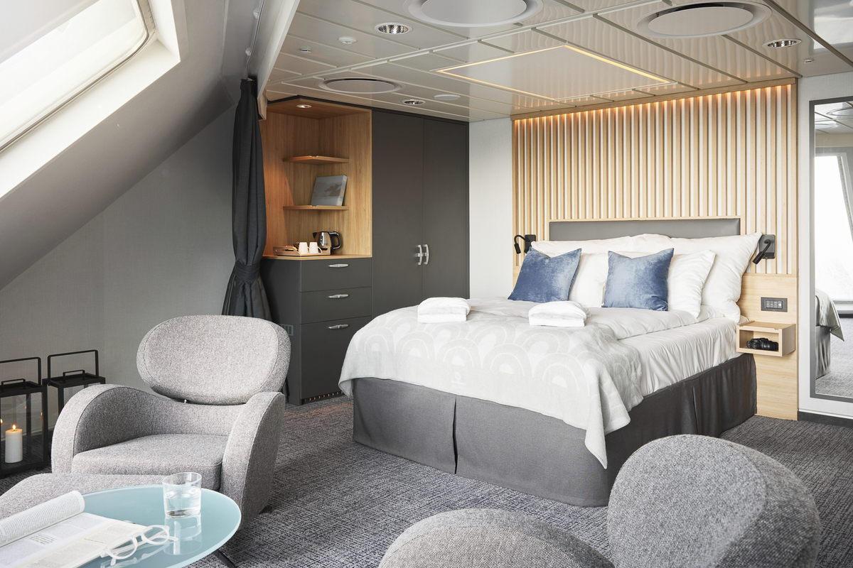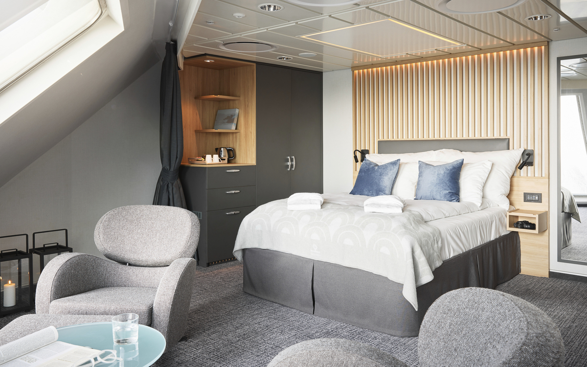 Hier wohnen, essen und schlafen Sie in einer Umgebung, die die Natur widerspiegelt, durch die Sie fahren. Die Einrichtung ist inspiriert vom Meer, dem Himmel, den Bergen und Gletschern, die Gerichte sind lokale Spezialitäten der Städte und Dörfer, die Sie vom Schiff aus sehen können.