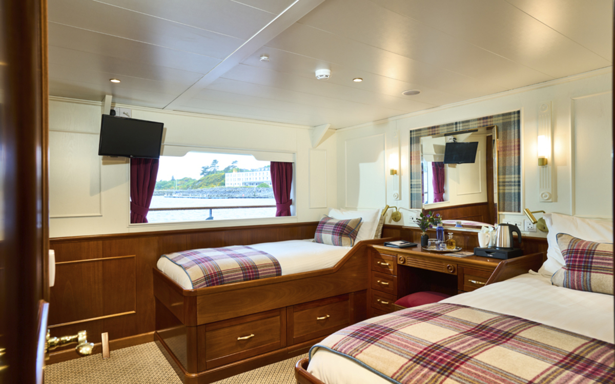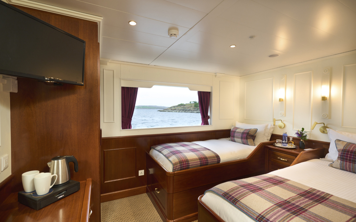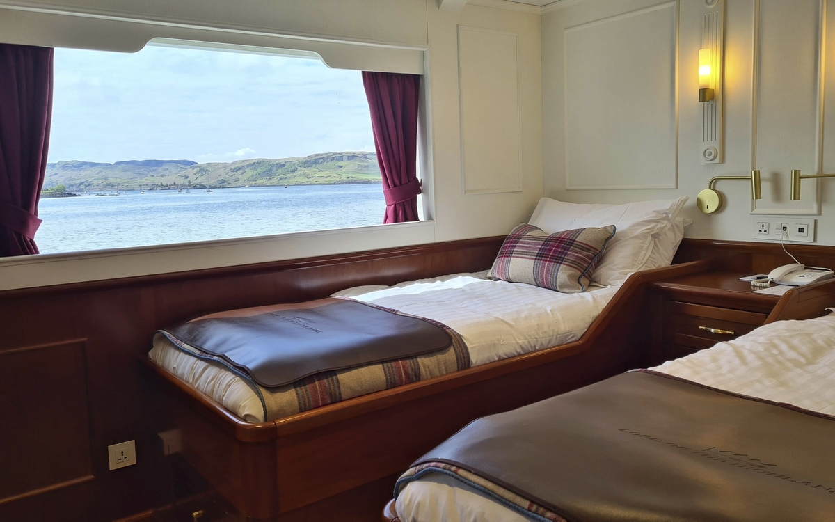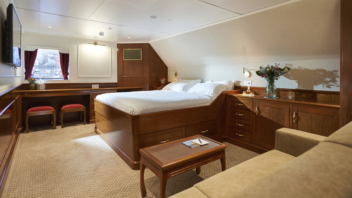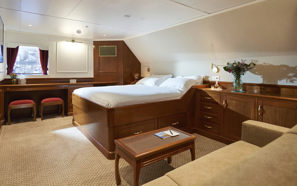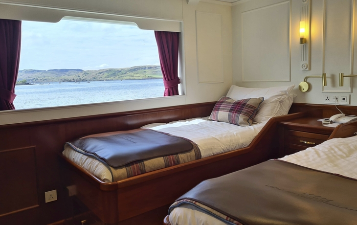 Alle 19 Kabinen verfügen über Dusche/WC, Frisiertisch, Föhn, Telefon, TV/Radio, Safe und eine individuell regulierbare Heizung/Klimaanlage. Die Standard-Kabinen (ca. 12 m²) auf beiden Decks verfügen über zwei getrennte Betten und grosse nicht zu öffnende Panoramafenster. Die Superieur-Kabinen (ca. 13 m²) sind ebenfalls mit zwei getrennten Betten ausgestattet sowie einem Privatbalkon. Die Suite auf dem John Buchan Deck (ca. 24 m²) verfügt über ein grosses Doppelbett, eine Sitzecke mit Minibar und Fenstern auf beiden Seiten.