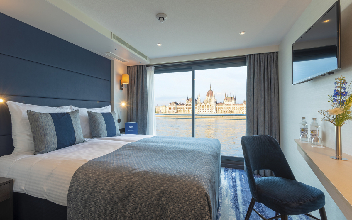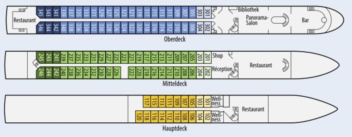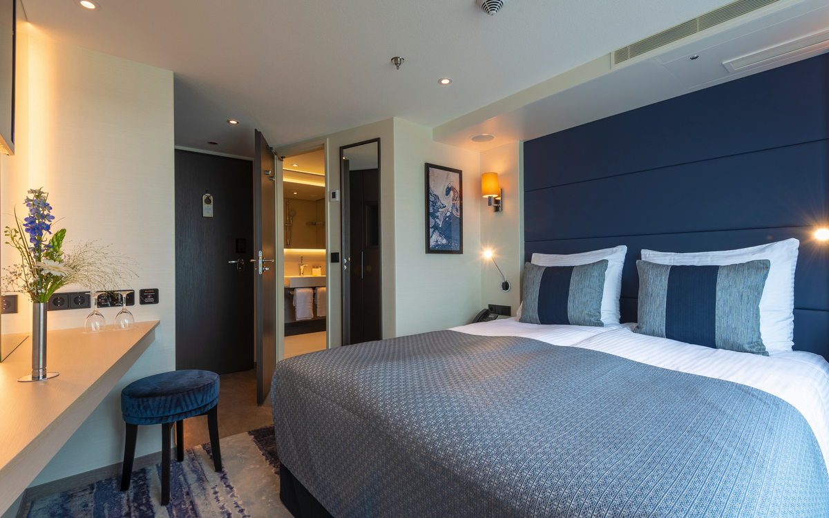 Alle ca. 14 m² grossen Kabinen sind aussen liegend, mit hellen Farben und modernem Design ausgestattet. Sie verfügen über ein bequemes Doppelbett, das auf Wunsch getrennt gestellt werden kann, Bad mit Dusche/WC, Föhn, Safe, TV/Radio und individuell regulierbare Klimaanlage. Die Kabinen auf dem Mittel- und Oberdeck haben einen französischen Balkon. Auf dem Hauptdeck lassen sich die grossen Fenster nicht öffnen.