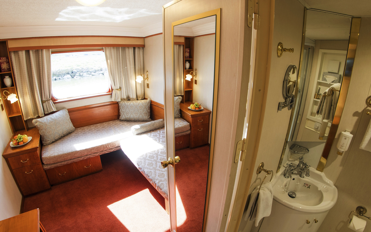 Alle 71 Kabinen sind Aussenkabinen und komfortabel und geschmackvoll eingerichtet. Sie verfügen über Dusche/WC, Föhn, Klimaanlage, TV, Bordradio, Telefon und einen kleinen Kühlschrank.