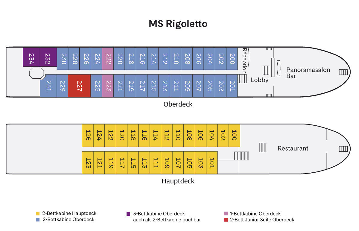 Die MS Rigoletto ist ein sehr gemütliches und gepflegtes Flussschiff mit schönem Salon, Bar, Reception, Bord-Shop, kleiner Bibliothek und Restaurant, wo Sie Ihre Mahlzeiten geniessen. Die ansprechende Inneneinrichtung ist geprägt von einer harmonischen Farbgestaltung, gepaart mit Holz und Messing. Grosse Panoramafenster im Salon ermöglichen gute Ausblicke auf die vorbeiziehenden Landschaften. Alle öffentlichen Räume sowie die Kabinen sind klimatisiert. Teilweise überdachtes Sonnendeck mit Sitzplätzen, Aussenbar und Abstellmöglichkeiten für die Velos. Nichtraucherschiff (Rauchen auf dem Sonnendeck erlaubt).