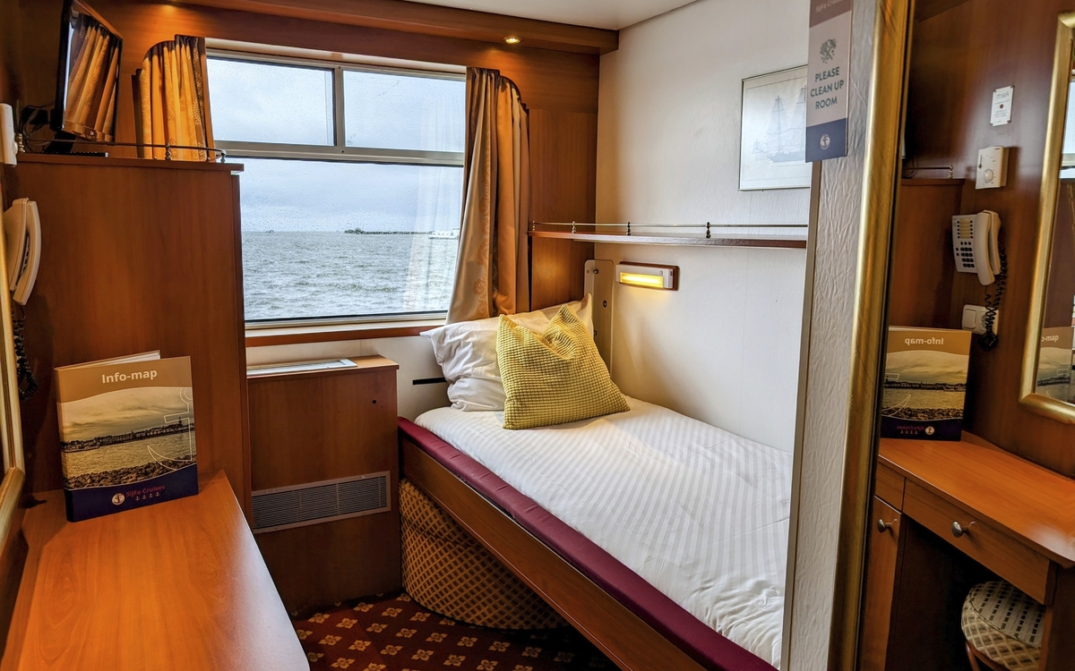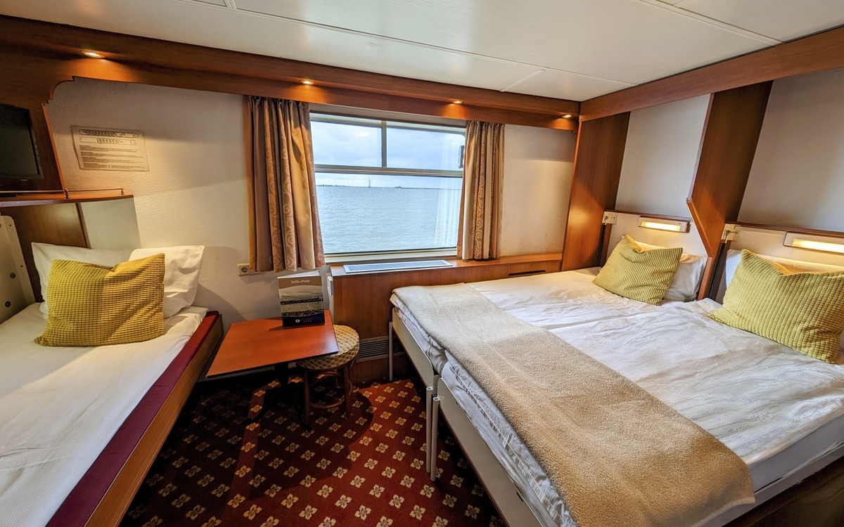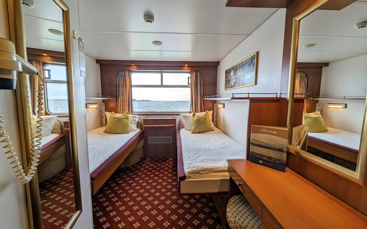 Die insgesamt 57 Kabinen sind freundlich und komfortabel eingerichtet und mit Dusche/WC, Föhn, Bordtelefon, TV/Radio, Safe und Klimaanlage ausgestattet. Alle Kabinen auf beiden Decks verfügen über ein grosses Panoramafenster, dessen oberer Teil zu öffnen ist. Die 25 2-Bettkabinen auf dem Hauptdeck und 28 2-Bettkabinen auf dem Oberdeck haben eine Grösse von ca. 11,5 m2 und sind mit zwei untenstehenden Pullman-Betten ausgestattet (können tagsüber auf Wunsch verstaut werden). Auf dem Oberdeck befinden sich zudem zwei 1-Bettkabinen (ca. 8 m2) mit einem Pullman-Bett, eine 3-Bettkabine (ca. 12 m2) mit zwei Schrankbetten und einem Pullman-Bett sowie eine eine Juniorsuite (ca. 22 m2) mit einem Doppelbett und einer kleinen Sitzgruppe mit zwei Sesseln.