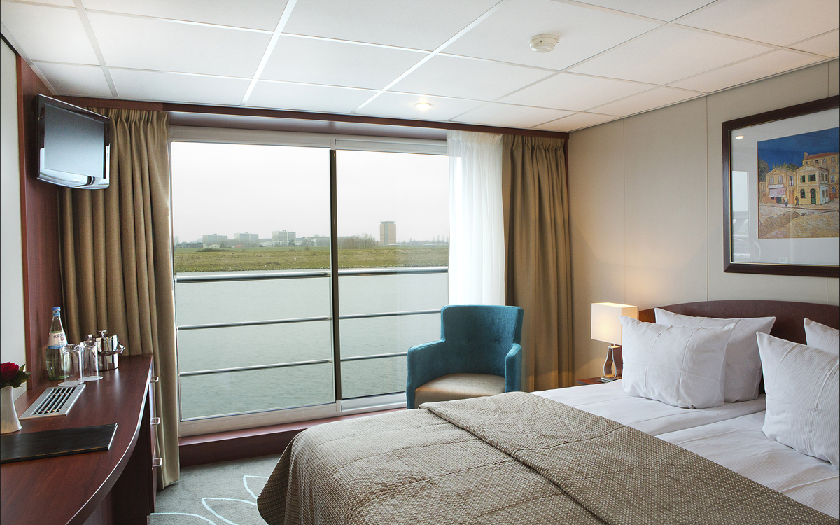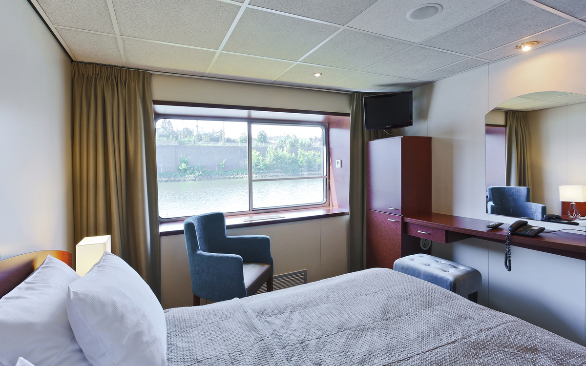 Alle 74 Kabinen sind Aussenkabinen, ca. 14 m² gross und komfortabel mit Hotelbetten eingerichtet. Sie verfügen über Dusche/WC* (*Kabinen Nr. 306, 307, 308, 309 mit Badewanne), Föhn, TV, Safe, Haustelefon, Minibar und einer individuell regulierbaren Klimaanlage.