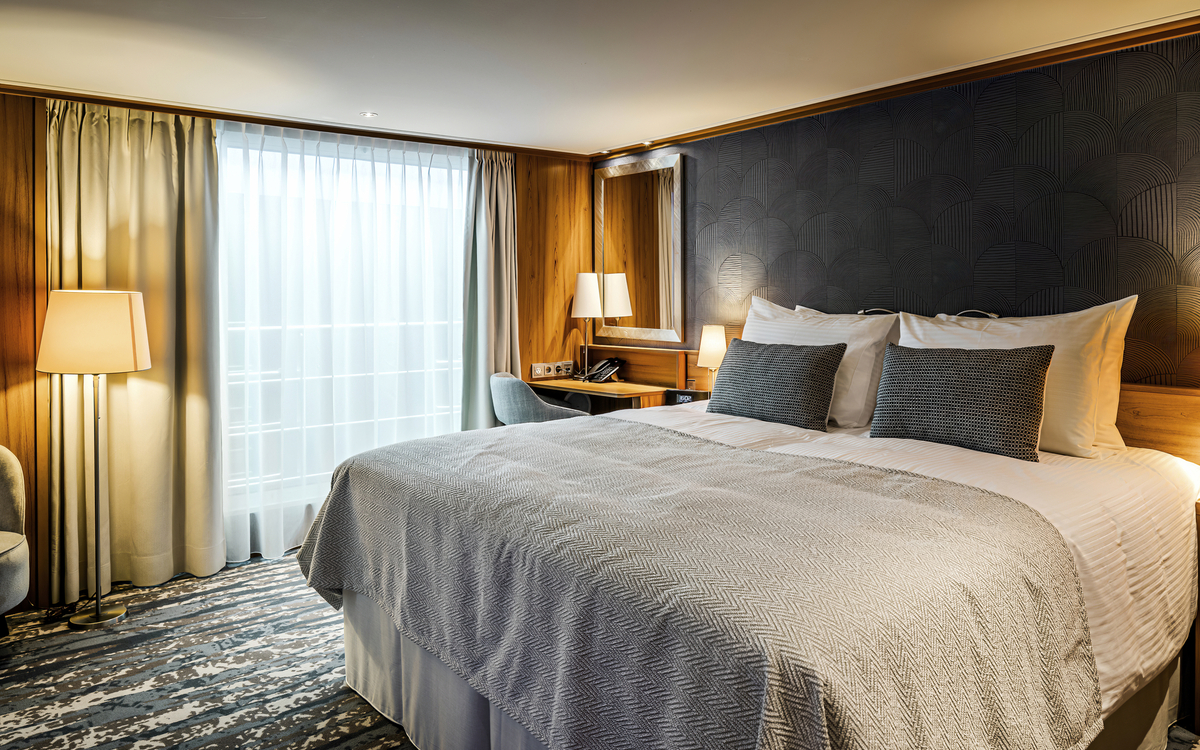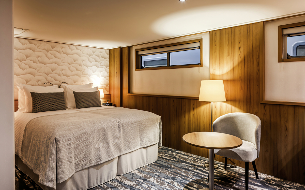 Alle 2-Bettkabinen (ca. 16 m²), 1-Bettkabinen (ca. 11 m²), Suiten (ca. 24 m²) und die Master Suite (ca. 32 m²) liegen aussen, sind komfortabel und stilvoll eingerichtet. Auf dem Mittel- und Oberdeck mit französischem Balkon, auf dem Hauptdeck sind die kleineren Fenster aus Sicherheitsgründen nicht zu öffnen. Alle Kabinen sind mit Dusche/WC, Föhn, Kühlschrank, Nespressomaschine, Safe, TV/Radio und individuell regulierbarer Klimaanlage ausgestattet. Die Suiten verfügen über ein zusätzliches Sofa und eine Badewanne anstelle der Dusche. Die Master Suite ist mit einem zusätzlichen Sofa und separater Badewanne ausgestattet.