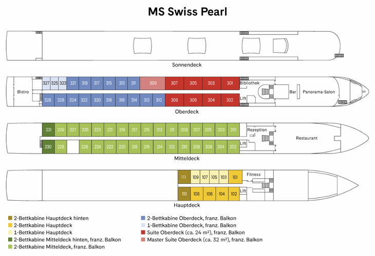 Die MS Swiss Pearl wurde 2013 gebaut und zuletzt im Winter 2024 renoviert. Das komfortable Schiff bietet seinen 133 Gästen reichlich Platz in den geschmackvoll eingerichteten Gesellschaftsräumen und auf dem Sonnendeck.