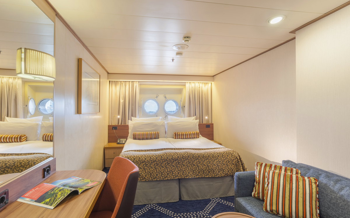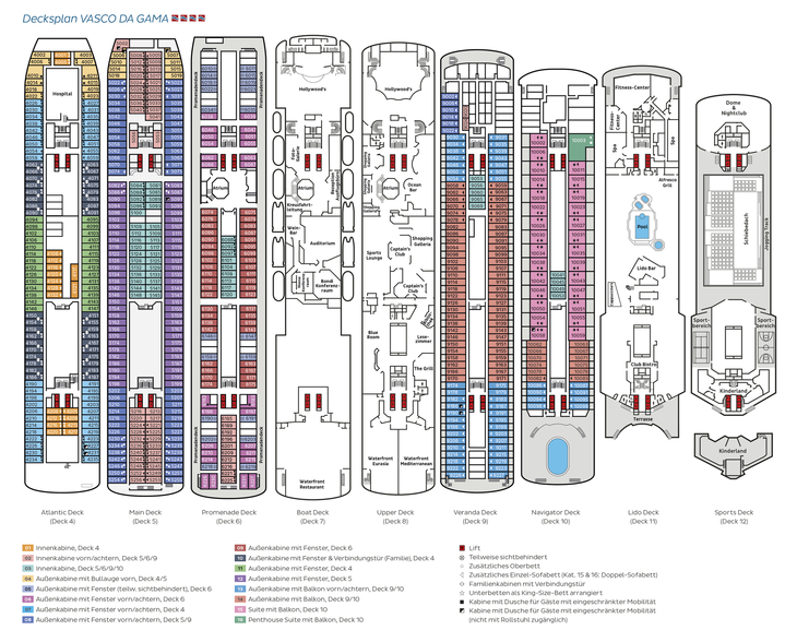 Familiäres Ambiente und geschmackvolles Design erwarten Sie an Bord der Vasco da Gama. Mit einer Kapazität von ca. 1000 Passagieren bleibt viel Raum für Ihr individuelles Kreuzfahrterlebnis. Das klas sischschöne Hochseeschiff bietet Ihnen eine grosse Auswahl unterschiedlicher Innen, Aussen, Familien und Balkonkabinen sowie Suiten. Die ca. 13 bis ca. 102 m² grossen Kabinen und Suiten bieten höchsten Wohlfühlfaktor und entspannte Atmosphäre. Sie sind mit Kleiderschrank, Dusche oder Badewanne, WC, individuell regulierbarer Klimaanlage/Heizung, Safe, Föhn und TV ausgestattet. Die Betten können auf Wunsch getrennt gestellt werden. Zur Bordausstattung gehören fünf Restaurants, sieben Bars und Cafès in unterschiedlichen Designs. Im ShowTheater «Hollywood’s» über zwei Decks bietet Ihnen das bordeigene ShowEnsemble erstklassige Abendunterhaltung. Platz für Entspannung oder sportliche Aktivitäten bieten der Wellnessbereich mit Sauna und Dampfbad, ein grosses FitnessCenter, Sportflächen auf den Aussendecks sowie zwei Pools, davon einer mit Glasschiebedach. Ein Lift verbindet alle Decks miteinander. WLAN gegen Gebühr, nach Verfügbarkeit. Nichtraucherschiff (Rauchen nur in gekennzeichneten Bereichen auf dem Aussendeck gestattet.) Das Schiff ist nicht barriere frei. Familien-Plus: Spezielle Aussenkabinen mit Fenster und Verbindungstür (Kategorie 10). Für Kinder ab 3 Jahren steht an Bord ein grosszügiger betreuter Spielbereich mit Innen und Aussen flächen, der sich über 2 Decks erstreckt, zur Verfügung.