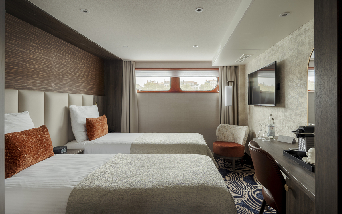 Das 2004 gebaute und im 2023 renovierte Schiff bietet Platz für max. 152 Personen. Alle 70 Doppelkabinen (ca. 14 m²) und 6 Junior-Suiten (ca. 17 m²) sind aussenliegend, stilvoll eingerichtet und komfortabel ausgestattet – unter anderem mit Dusche/WC, Föhn, Kühlschrank, Nespressomaschine, Safe, TV/Radio sowie individuell regulierbarer Klimaanlage. Ein besonderes Highlight der Junior-Suiten ist die elegante Badewanne mit integrierter Duschfunktion.
