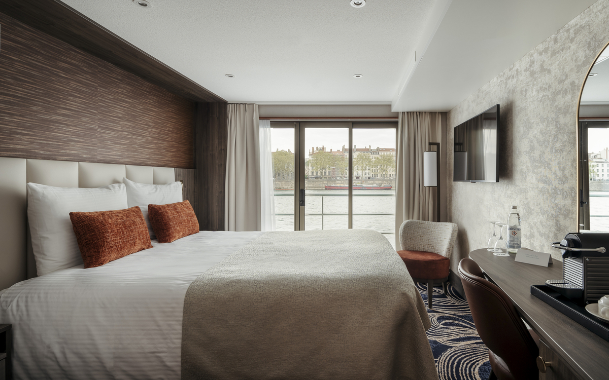 Alle Kabinen (ca. 14 m2) und Juniorsuiten (ca. 17 m²) liegen aussen, sind komfortabel und luxuriös eingerichtet. Auf dem Mittel- und Oberdeck mit französischem Balkon, auf dem Hauptdeck sind die kleineren Fenster aus Sicherheitsgründen nicht zu öffnen. Alle Kabinen sind mit Dusche/WC, Föhn, Kühlschrank, Nespressomaschine, Safe, TV/Radio und individuell regulierbarer Klimaanlage ausgestattet. Die Junior Suiten verfügen über eine Badewanne.